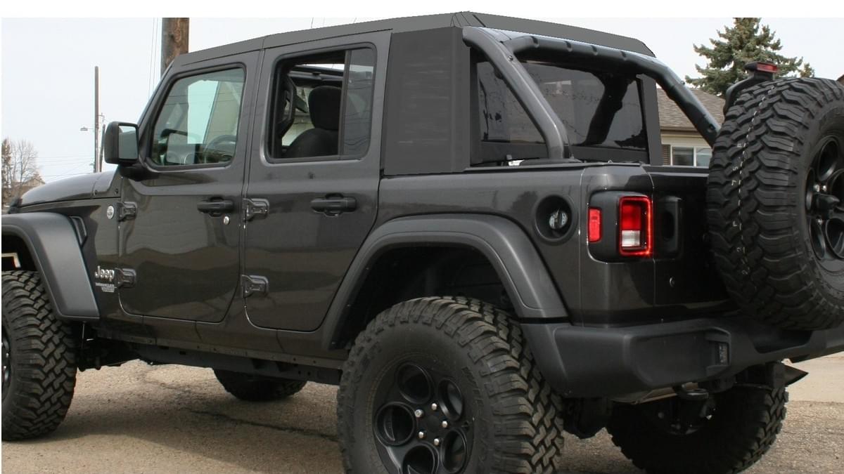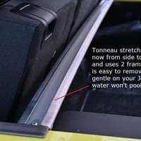 The framed roof's rear edge is capped off with a factory style rear flap. The sides are flush to the body with new structure technology using tongue and groove belt tracks to control arches, turns and curves. Beauty is power and this top is the sword. The front roof flips-open or rolls forward. The tonneau cover is gentle on your Jeep body so you won't hesitate to remove it anytime. No roll bar cover is cooler.
